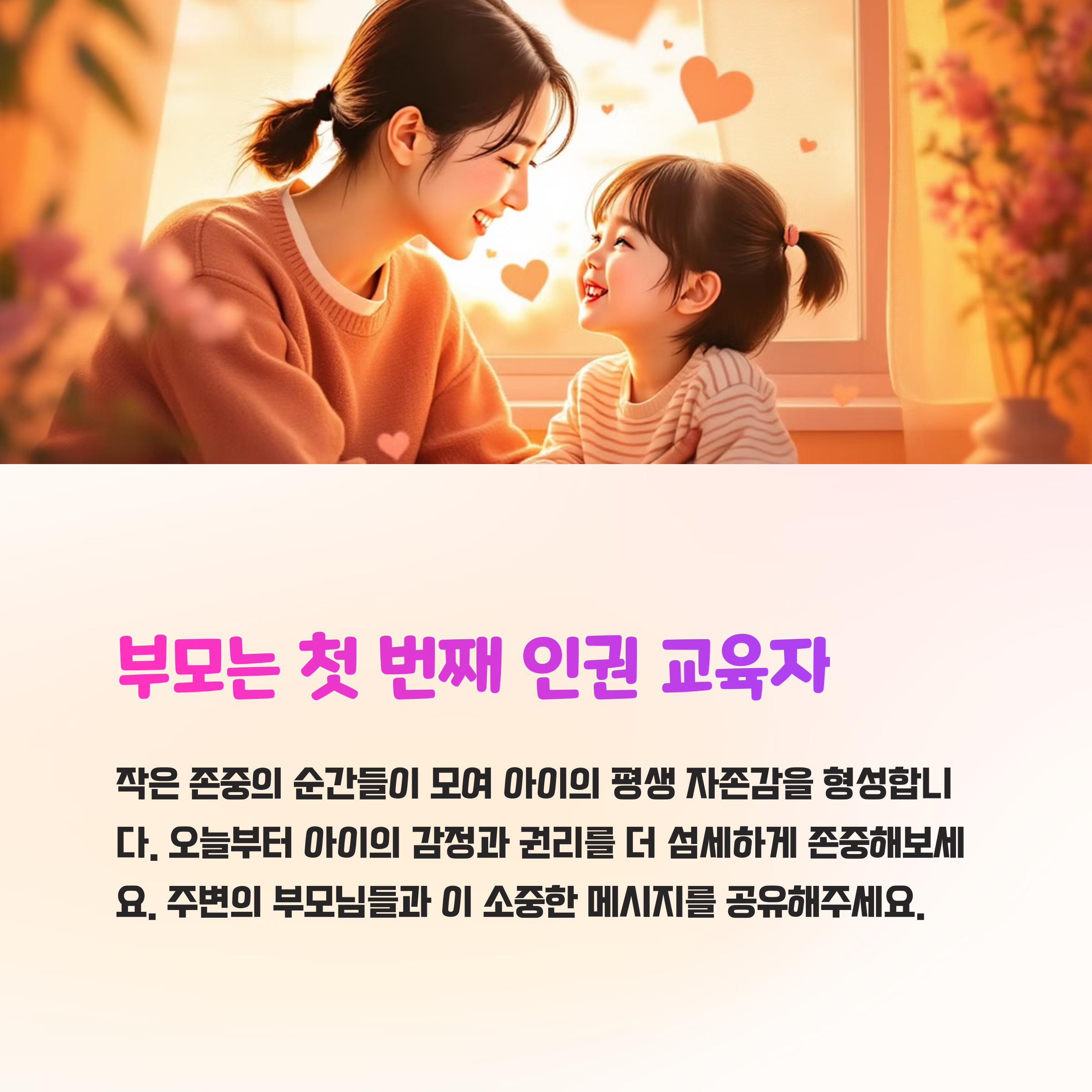 권리교육은 먼 미래가 아닌 오늘 저녁 식사 시간에도 시작할 수 있습니다. 지금, 부모인 당신이 아이의 첫 번째 권리 지킴이가 되어주세요.