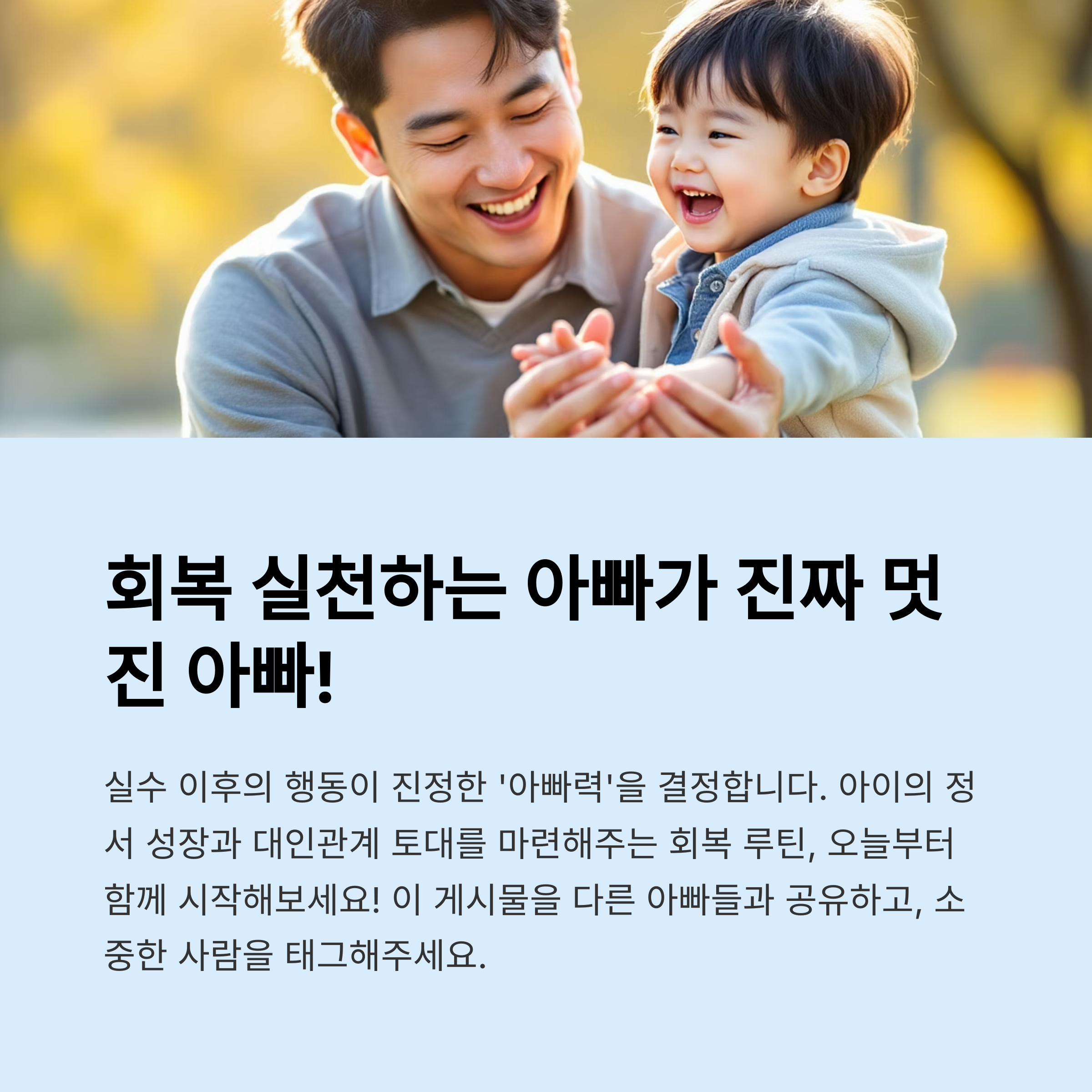 이 글에서는 감정 폭발 후 아이와의 관계를 회복하는 아빠의 대화법과 실전 회복 루틴을 소개한다. 중요한 건 완벽한 아빠가 되는 게 아니라, 실수 후에도 회복할 줄 아는 아빠가 되는 것이다.