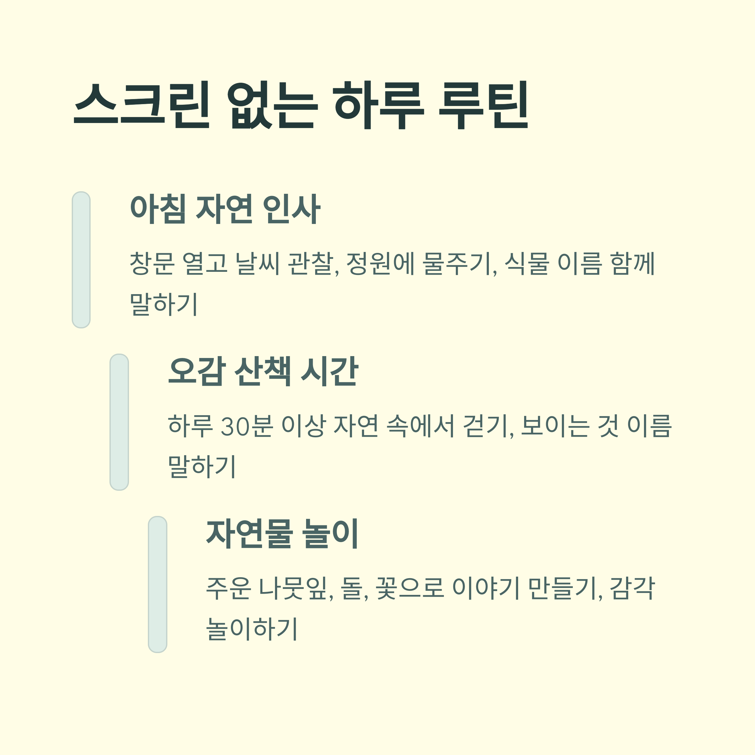 디지털 기기가 넘쳐나는 시대지만, 3세 이전 아이에게는 되도록 스크린 노출을 줄이는 것이 권장된다. 아래는 스크린 없이도 충분히 언어 발달을 유도할 수 있는 하루 루틴 예시이다.