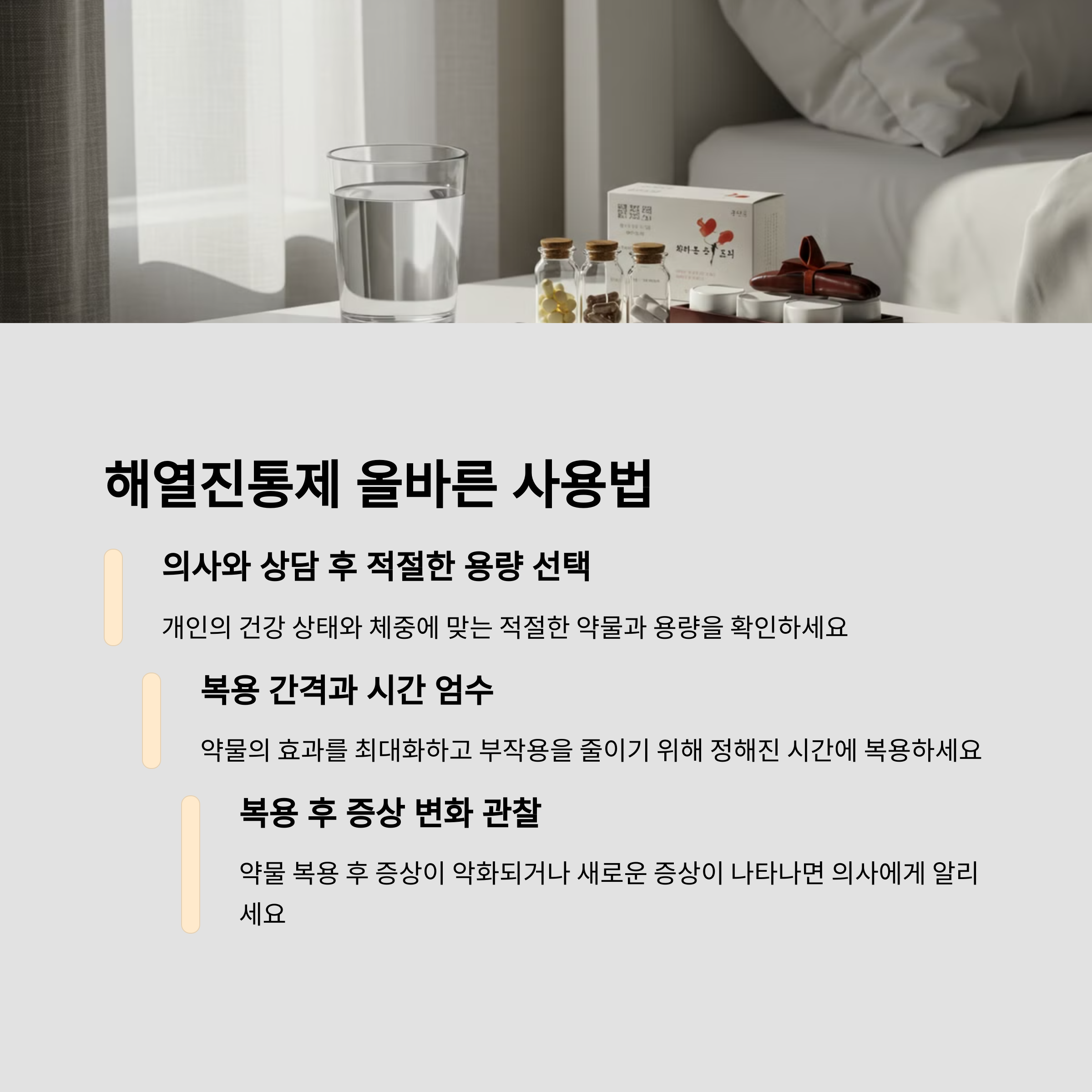 고열이나 심한 두통이 나타날 경우, 전문의의 상담 하에 해열진통제를 복용할 수 있습니다. 일반적으로 타이레놀(아세트아미노펜 성분)이 권장되며, 부작용을 심하게 느끼는 경우에는 반드시 의사의 진료를 받아야 합니다.