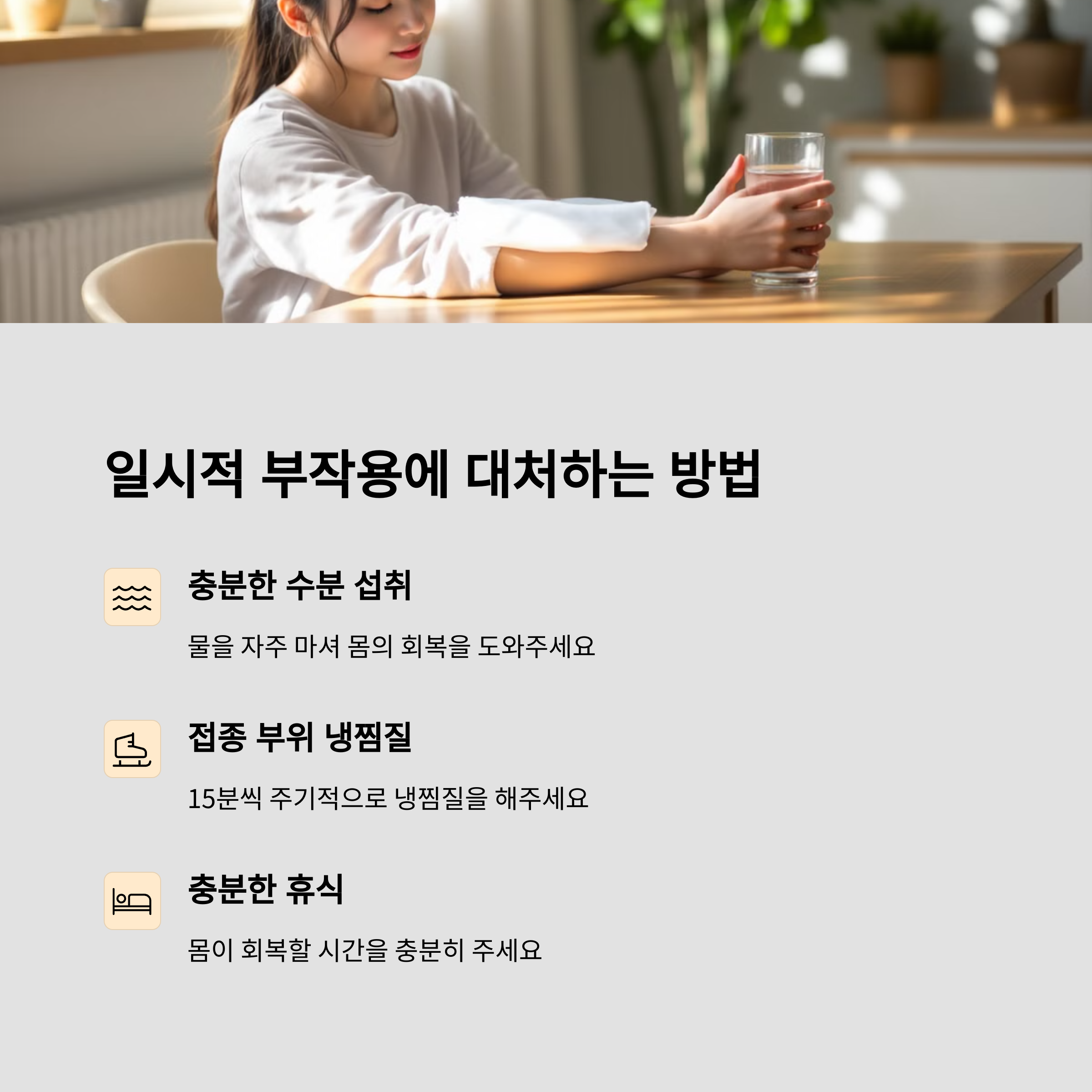 예방접종은 건강을 지키기 위한 중요한 선택입니다. 일시적인 부작용이 무섭다고 해서 접종을 회피하는 것은 오히려 더 큰 위험에 노출될 수 있습니다. 위에서 소개한 방법들을 통해 접종 후 나타날 수 있는 불편함을 미리 예방하고, 보다 편안하게 회복할 수 있도록 준비해보세요.