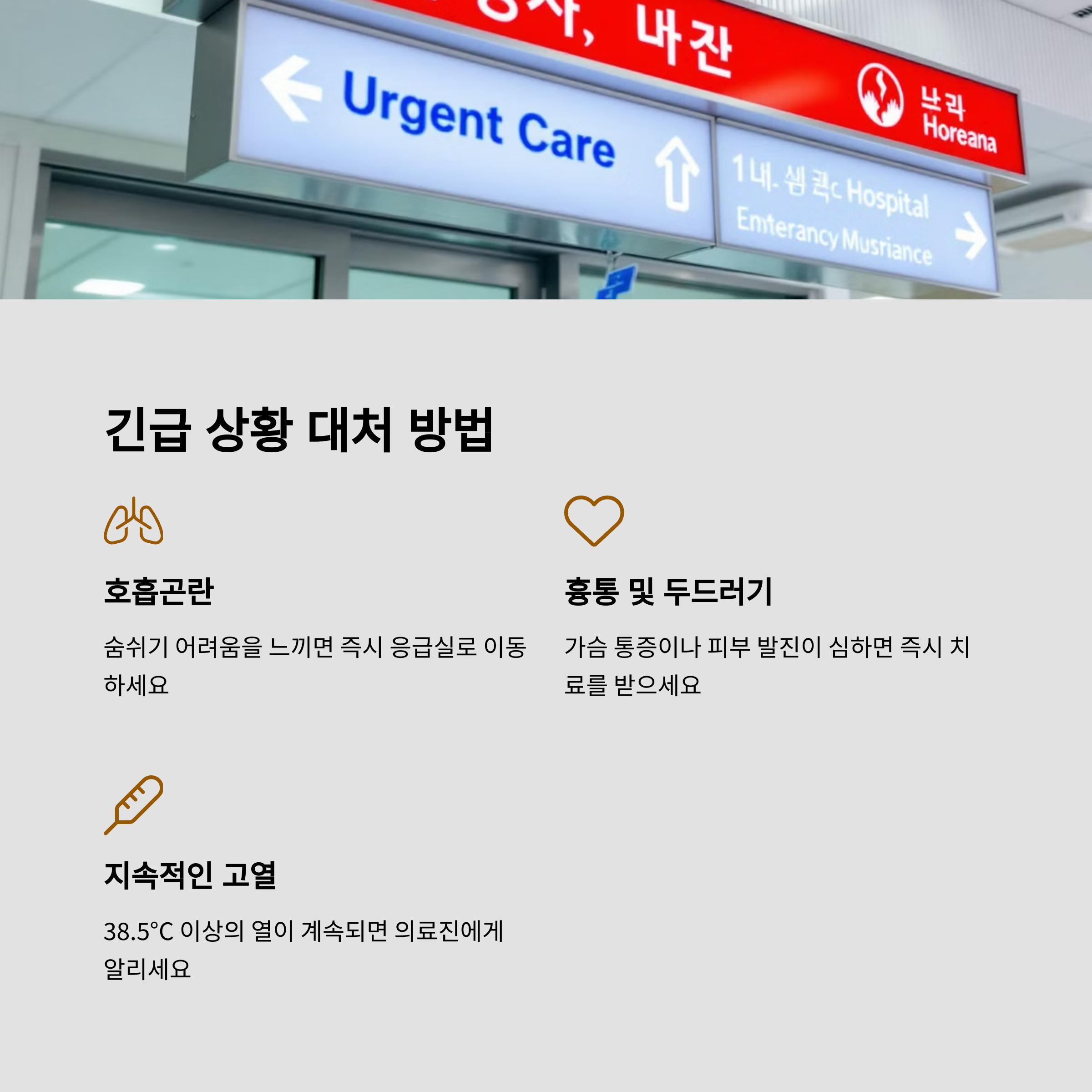 대부분의 부작용은 하루 이틀 안에 사라지지만, 호흡곤란, 심한 두드러기, 흉통 등의 증상이 나타날 경우에는 즉시 병원을 방문해야 합니다. 특히 아나필락시스와 같은 중증 반응은 신속한 대응이 중요합니다.