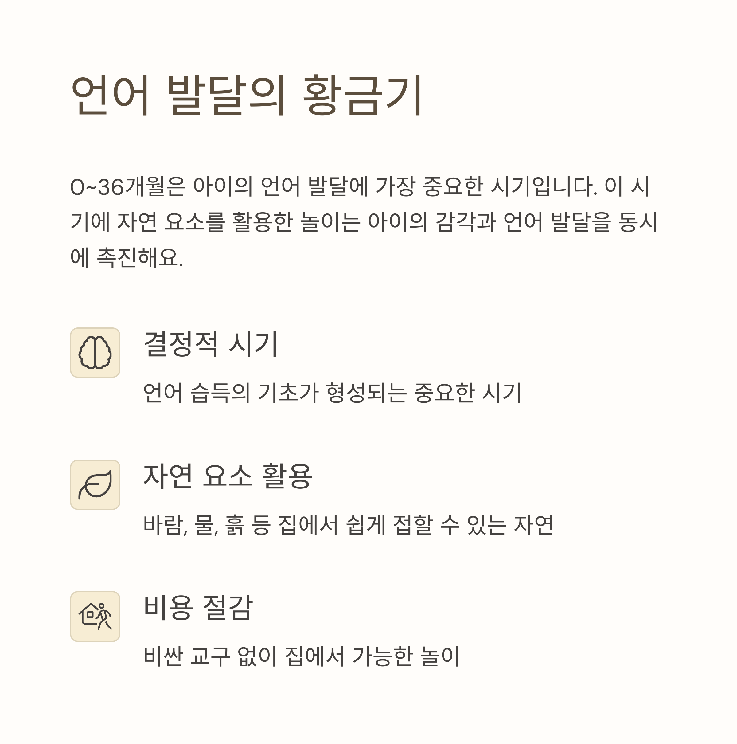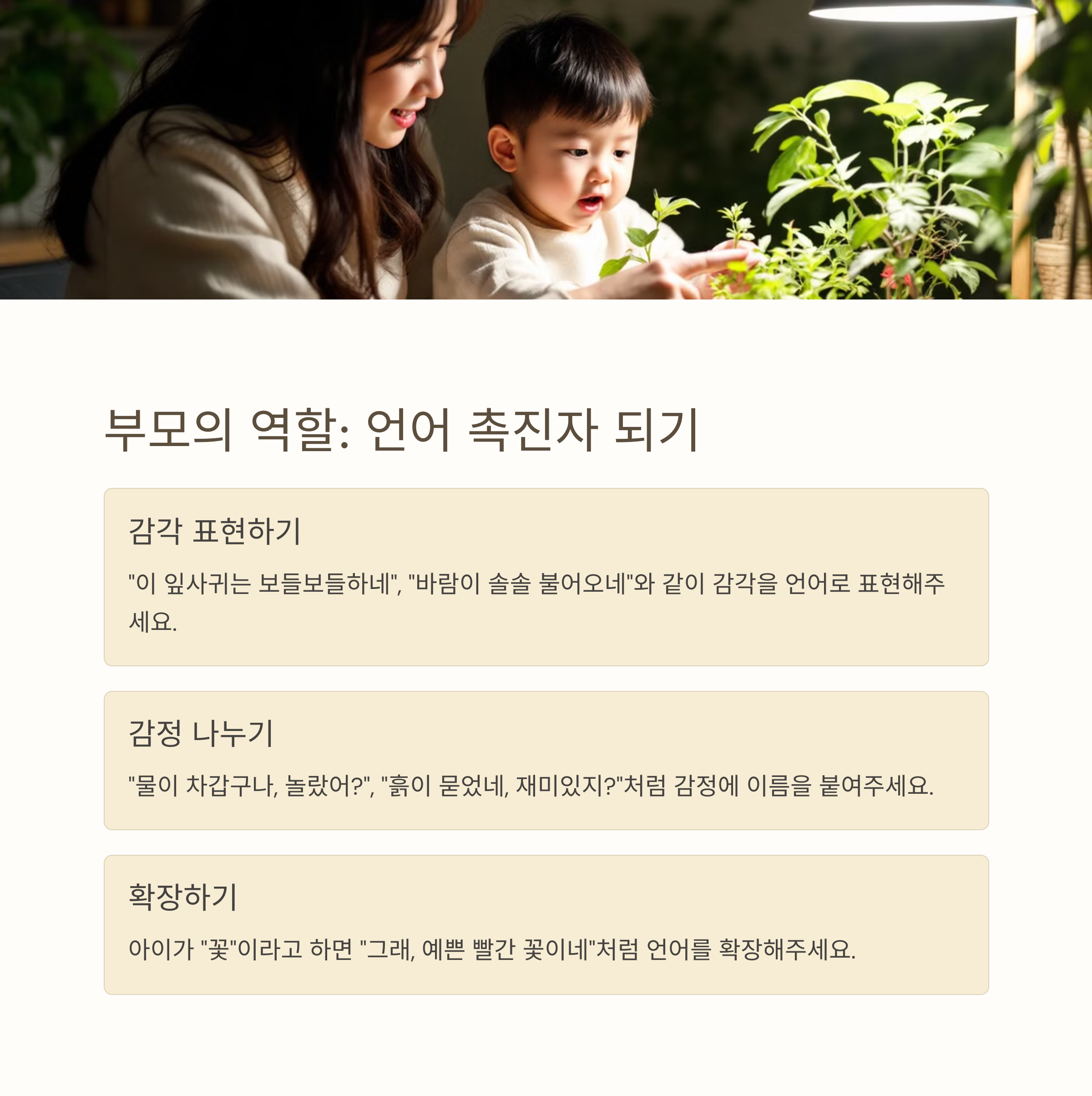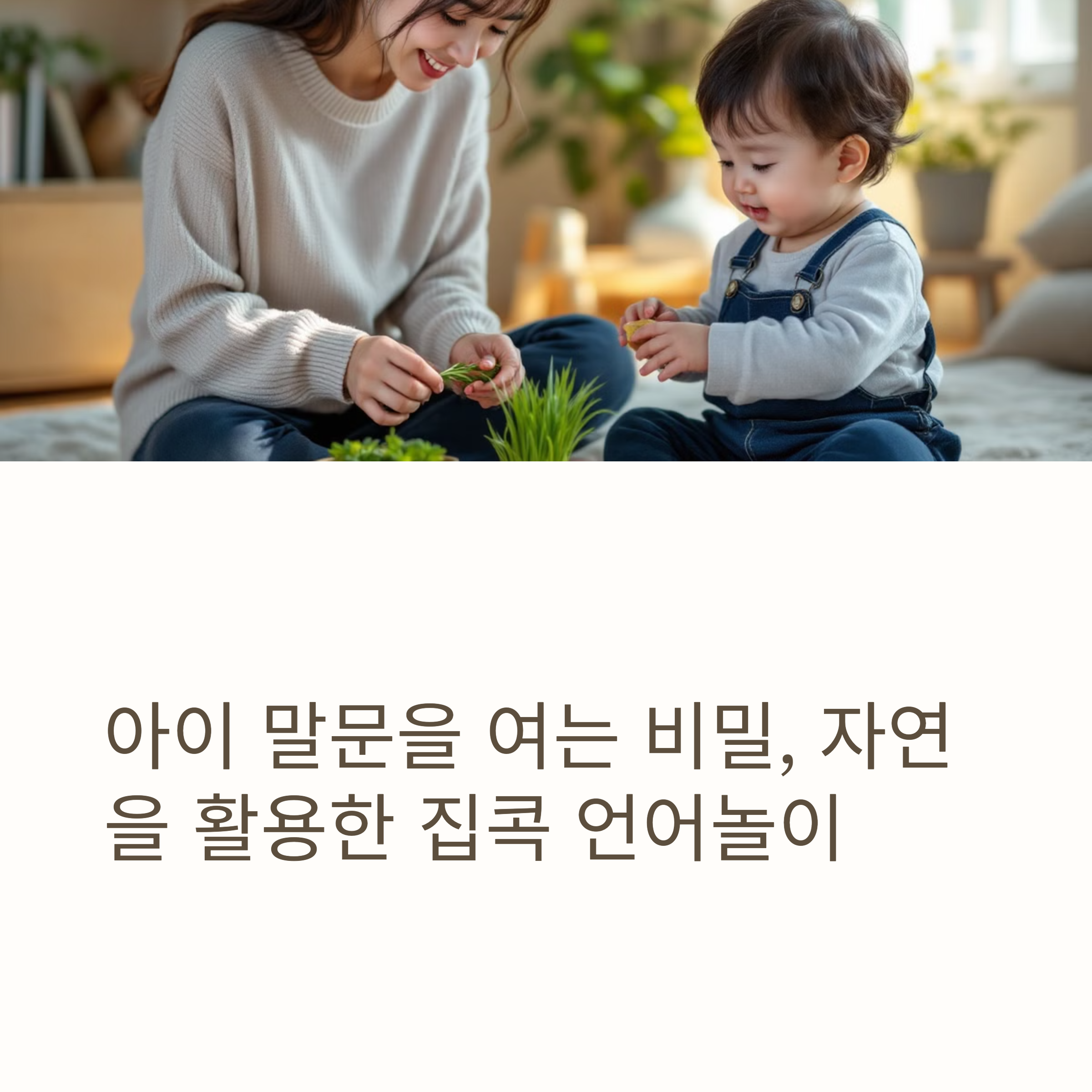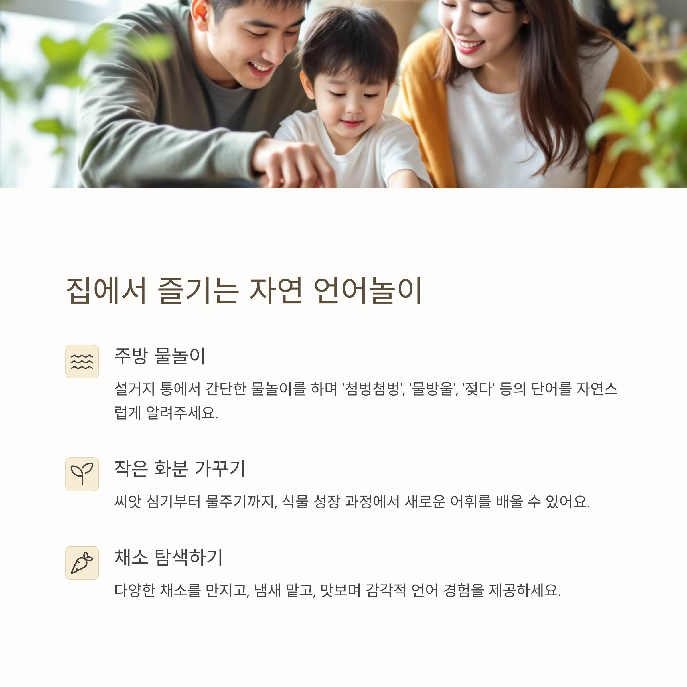 포인트: 외출 없이도, 집 안에서 바람, 물, 흙, 식물, 소리 등 ‘자연의 요소’를 경험시키면 충분히 자연언어 학습이 가능하다.