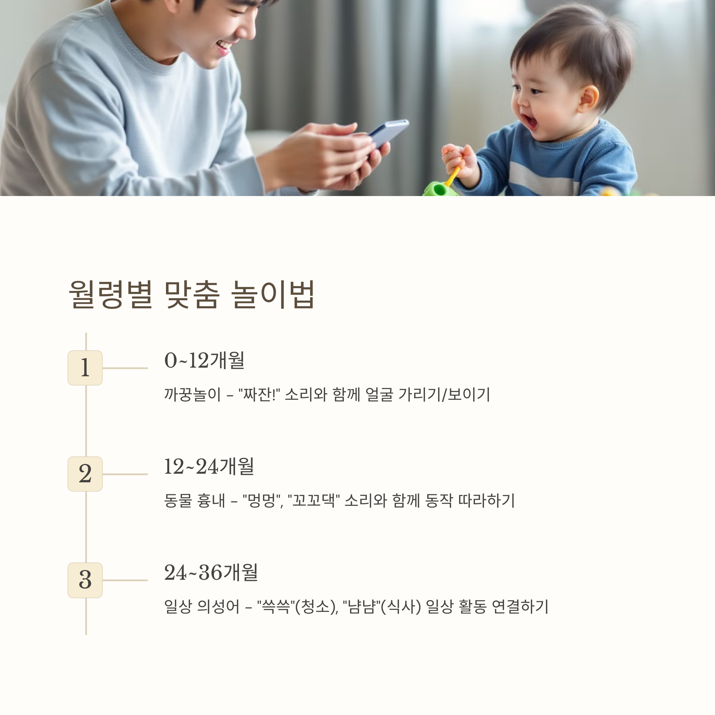 | 24~36개월 | 인형 걸음 놀이, 동물소리 따라하기 | “살금살금”, “멍멍”, “꿀꿀” | 움직임 묘사, 의인화 |